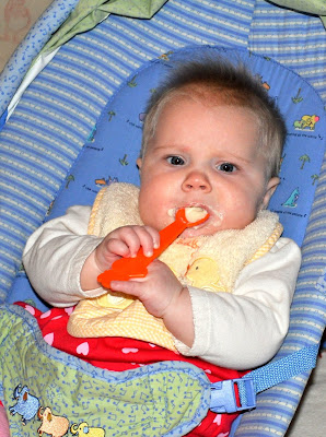 I love the pic of all the kids. And Baby K is so cute eating her cereal—and holding her own spoon no less. Awesome!