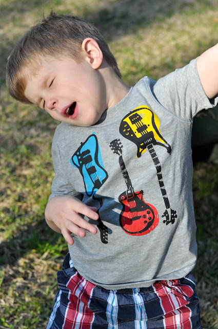 I went shopping the other day and found SO many cute Spring clothes for K. I walked out with 4 bottoms and 4 tops and a pair of the cutest silver sandals. Oh and a bonus shirt for G. Because he likes guitars. And he likes to pretend to rock out. Obviously. 🙂