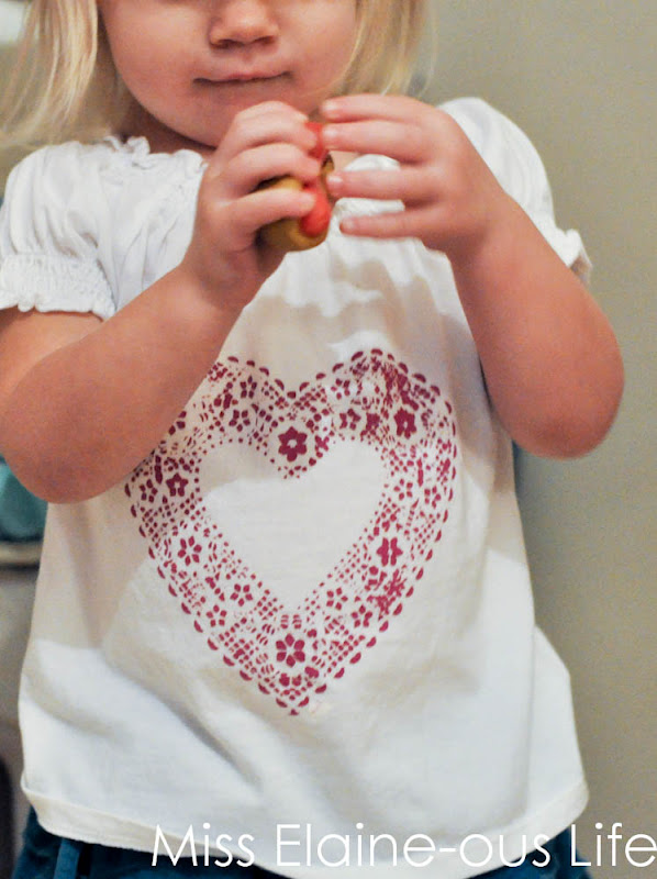 And I painted the shirt when I saw this idea in Family Fun magazine. I wish I had placed the heart a bit higher on the shirt and the paint came through a little thicker on one side but I still think it turned out pretty cute. It was only my first attempt and I am pretty sure this gives me a great excuse to make another one. You know, for next year! Besides, practices makes perfect, or something like that.
