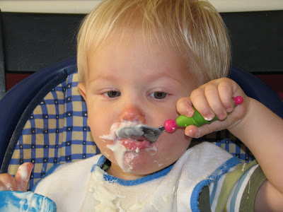 He is so cute! My son had such a hard time learning to use a spoon. I honestly think it has only been in the last few months that he has really gotten good at it.