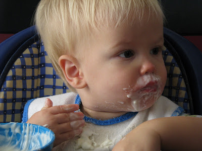 Wow, that’s a mess! Adorable but I think he looks like a yogurt explosion. hehe