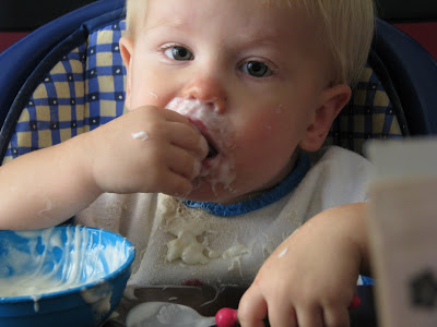 WHAT a sweetie 🙂 That is adorable, but messy. And that’s ok! My boys were big on feeding themselves too, and there’s just nothing neat and tidy about yogurt and a spoon. My little girl is 8 months, and I’m still able to dash the food into her mouth in between swings of her fists.