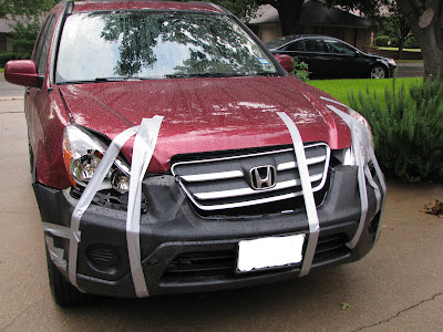 Oh, no! I’m so sorry to hear about your fender bender. I’m totally laughing at the duct-tape job. I just can’t help it. How nice of your victim to help you tape your car back together.