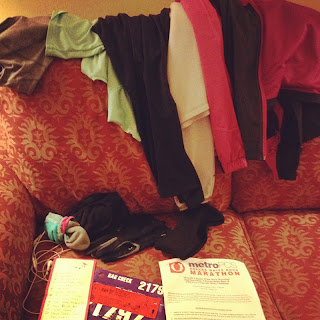 So, this was my gear, including an old sweatshirt (which saved my bacon!) and a waterproof jacket, gloves and some new awesome socks I got at the expo/packet pick up on Saturday.
