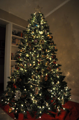 And here is a shot of the tree at night. As you can see the pre-lit tree has somewhat failed us. Please just focus your eyes on the top half of the tree and ignore the alternating dark spots. I have chosen to do so myself this year… 😉