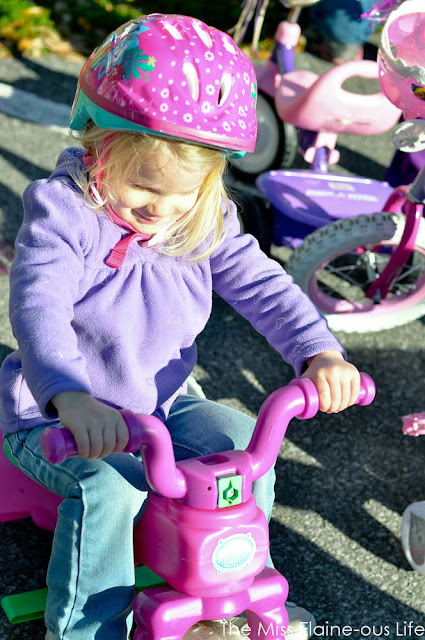 I had to go buy her a helmet for this event because they required all of the children to wear one and because well, she did not have one. The “trike” she rode I bought at Goodwill almost 2 years ago, before she could even ride on or in anything besides a stroller. And that her brother used to ride. She does not have a little bicycle like some of the kids do. She has a scooter and pedal-yourself car and well, a “new-to-her” trike. Hence, no helmet.