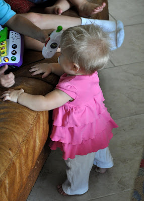 The boys and I giggled like children (oh wait…) as she popped up from behind the coffee table several times the other day. She was quite amused too, I assume more with OUR laughter than anything else. However, the boys are not NEARLY as amused that she can now get to the toys they have on the sofa or table. Yeah, not so much.