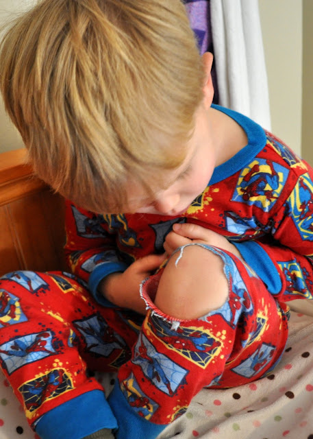 Tim recently picked out some jammies for the boys there and faster than I could say “Supercalifragilisticexpealidocious” there was a hole in one of the legs of the Batman set that The B Man wore, maybe twice.