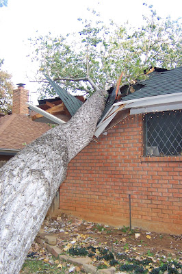 My biggest complaint (well, until last week anyway) with this house has been the tree issues we’ve had to endure. We had a tree fall on the back, right corner of the house just a little over a year after we moved in and one of the huge branches went right into Tim’s closet (of course the joke has always been thank GOD it wasn’t my closet or I may have been admitted to a room with padded walls…). Some people suggested we just go with it and install a sky light. Uh… no.