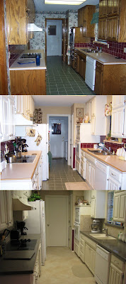 (The kitchen in 3 stages, how it was when we bought it, after some re-do and then FINALLY complete)