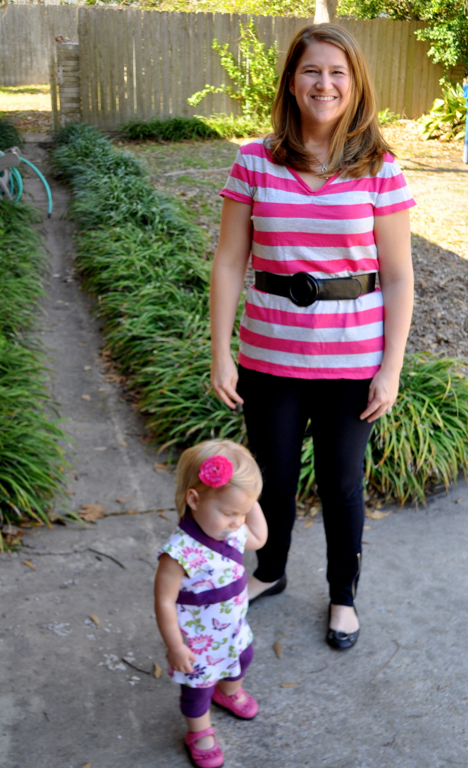 Congrats on the smaller waist! you look great! and I LOVE those shoes your little Miss has on. Totally going to search for some for my girls now!