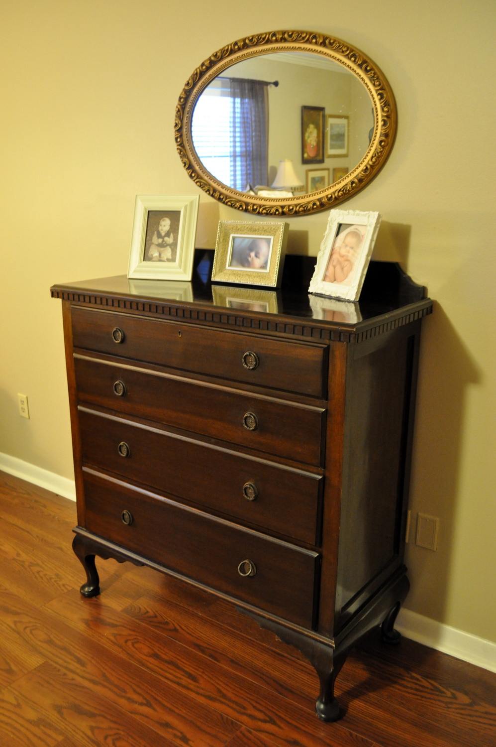 And after about 30 minutes of just browsing and seeing all kinds of cute things, I walked by IT and knew in an instant that I’d found the newest member of our furniture family. I don’t know how the dresser felt but for me it was totally love at first sight. I mean my heart started beating faster when I saw the awesome price (and beautiful Cabriolet style legs *sigh*).