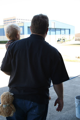 Watchin’ the helicopter take off (see the teddy bear in his back pocket?)