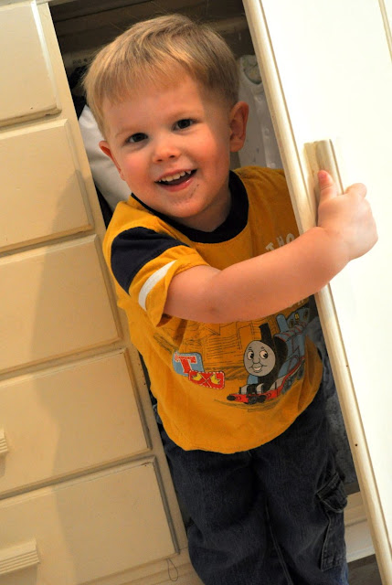 Thomas has stood the test of time! I remember babysitting for my little cousins when they were G’s age… they loved Thomas, we watched the tapes daily! Cute shot…so sneaky!