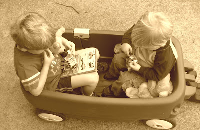 We were a little “late” in getting outside, but on Saturday we joined in remebrance of Tuesday and put the boys in the wagon and went for a walk as a family. It was a good day for it too. Here are the boys, ready to go, with some of their “pals” in tow, as well as a snack. I just LOVE those little blonde heads!!